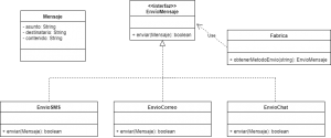 Teniendo la fábrica, la clase Mensajero ya no necesita métodos específicos por cada método de envío. Solo necesita pedirle a la fábrica un objeto de tipo EnvioMensaje, e invocar sobre este el método enviar.