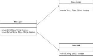 La clase Mensajero, en la siguiente imagen, tiene dos responsabilidades: enviar correos y enviar mensajes de texto.